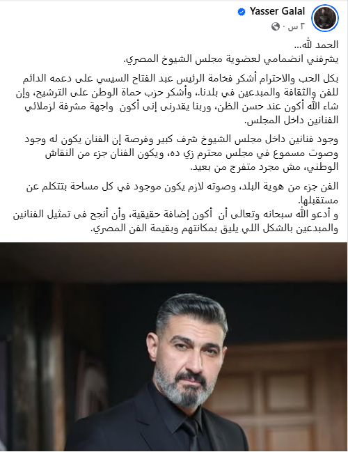 وأكد ياسر جلال أن وجود فنانين داخل مجلس الشيوخ هو شرف كبير، وفرصة حقيقية ليكون للفن صوت فاعل في النقاش الوطني، قائلًا: "مش مجرد متفرج من بعيد.. الفن جزء من هوية البلد، وصوته لازم يكون موجود في كل مساحة بتتكلم عن مستقبلها."
